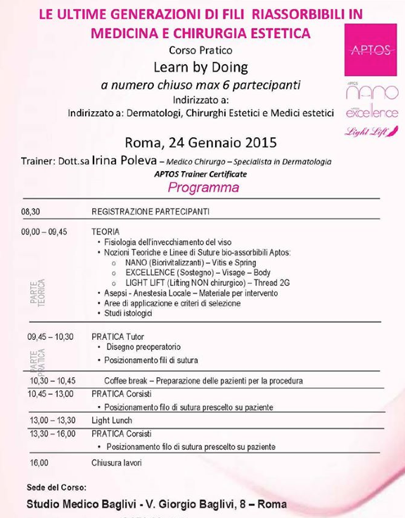 E’ passato un po’ di tempo dall’ultimo post, non mi sono rilassata, esattamente il contrario: sono state settimane ricche di eventi e di impegni. Il trend dei fili di sospensione riassorbibili è in crescendo e questo mi coinvolge personalmente come medico che pratica questa metodica e come trainer che la diffonde. In fatti, praticamente ogni weekend sono stata coinvolta in corsi o seminari dedicati ai fili APTOS. Ma quello che mi ha dato maggior soddisfazione ed emozione è stato il Corso teorico-pratico Anti-Aging VI edizione organizzato dallo stimato collega Prof. Andrea Corbo dove (udite udite!) il workshop dedicato alla metodica dei fili di sospensione APTOS è stato condotto dal Dott. George Sulamanidze e la sottoscritta!